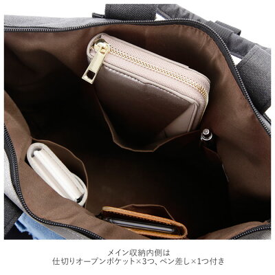 ・メイン収納内側には仕切りオープンポケット×3つ、ペン差し×1つ付きで、スマートフォンやリップクリームなど小物がすっきり片付く!・背面側に小さめオープンポケット付き。
