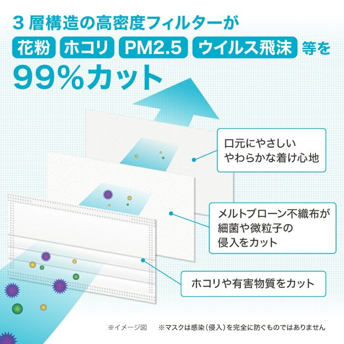 3層の不織布構造でウィルス飛沫、ほこり、花粉等のミクロ粒子をシャットアウト。